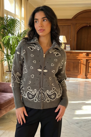 Un cardigan douillet et élégant, orné d'un motif bandana classique décliné en plusieurs coloris. Sa coupe décontractée et sa matière douce en font le vêtement idéal à superposer, tandis que son motif audacieux lui confère du caractère et une touche d'originalité. Confortable et facile à porter, ce cardigan apporte une note de modernité à votre style casual.