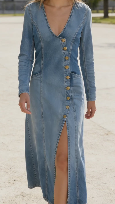 This stunning denim maxi dress is designed to highlight your natural silhouette while keeping you comfortable all day. The flattering V-neckline and fitted design create a feminine look, while the front slit adds a touch of elegance and movement.